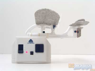 To save even more weight, the Aerosoar doesn't use a charging jack like most micro RC planes & helicopters have. Instead, the main circuit board just has one small extension that sticks out the bottom of the plane, and with this, you plug the plane into the controller / charger like so: