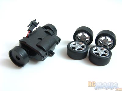 One thing that sets the Pro Class car apart is that it comes with a choice of two sets of wheel caps, two sets of real rubber tires (one normal treaded set and one super-soft, slick racing set), and my favorite part, an extra motor assembly that's supposed to make it go faster.