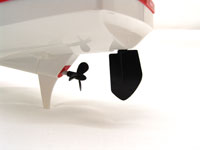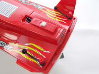 This is the very first RC watercraft I've reviewed for the site, so everything was new and interesting to me. This boat is not only sleek on the underside, but above the waterline as well, giving it a very fast-looking, aerodynamic profile. It has splash guards along the front and vertical stabilizers at the rear. It includes a small stand that makes display & storage on a shelf easy & convenient. I'm anxious to try this thing out!