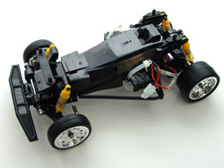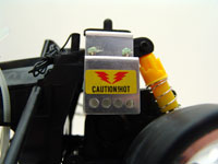 The tires are real rubber slicks that should have really good traction, and while the fronts seem a little skinny, the rears are nice & wide! It reminds me of a dragster. There's one metal-encased assembly part on the side that says "Caution! Hot," so I'm assuming that heats up when you're driving. Fortunately it'll be completely under the body and out of the way, and the battery isn't close either, so I'm not worried about accidentally burning myself. Okay, enough looking & talking, time to do some driving.